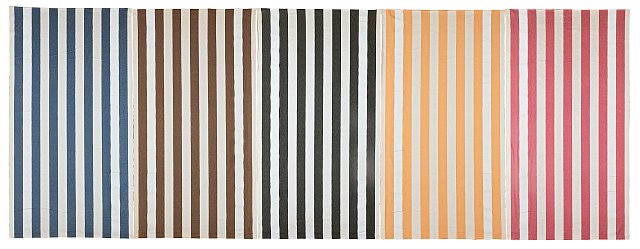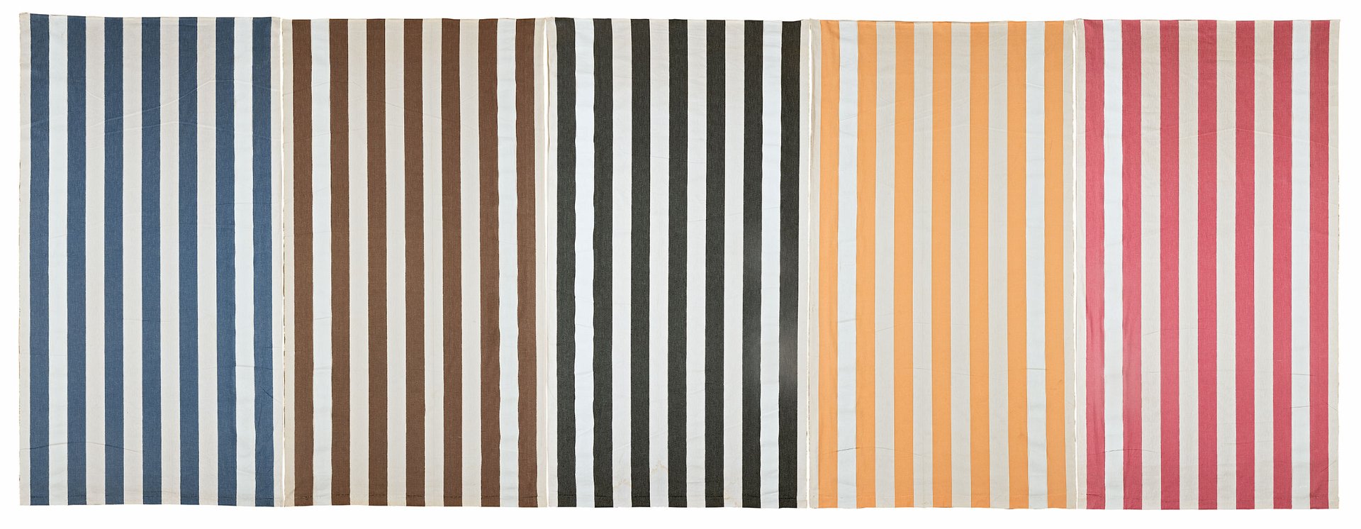 It was in 1971 that Daniel Buren created the work Untitled, composed of five fabric panels on which the artist painted alternating 8.7 cm white and coloured stripes. These stripes form the visual tool that Daniel Buren developed in 1965 following the discovery of striped awning fabrics in the Saint Pierre market in Paris. In this painting, each panel corresponds to an alternating colour of white, presented in alphabetical order : blue, brown, black, orange and red. The work is conceived as a whole : the five panels are placed side by side and are connected to each other without interruption thanks to the succession of coloured and white bands. The continuity, the repetition and the rhythm of the motif present in Untitled are essential elements in Daniel Buren’s work.