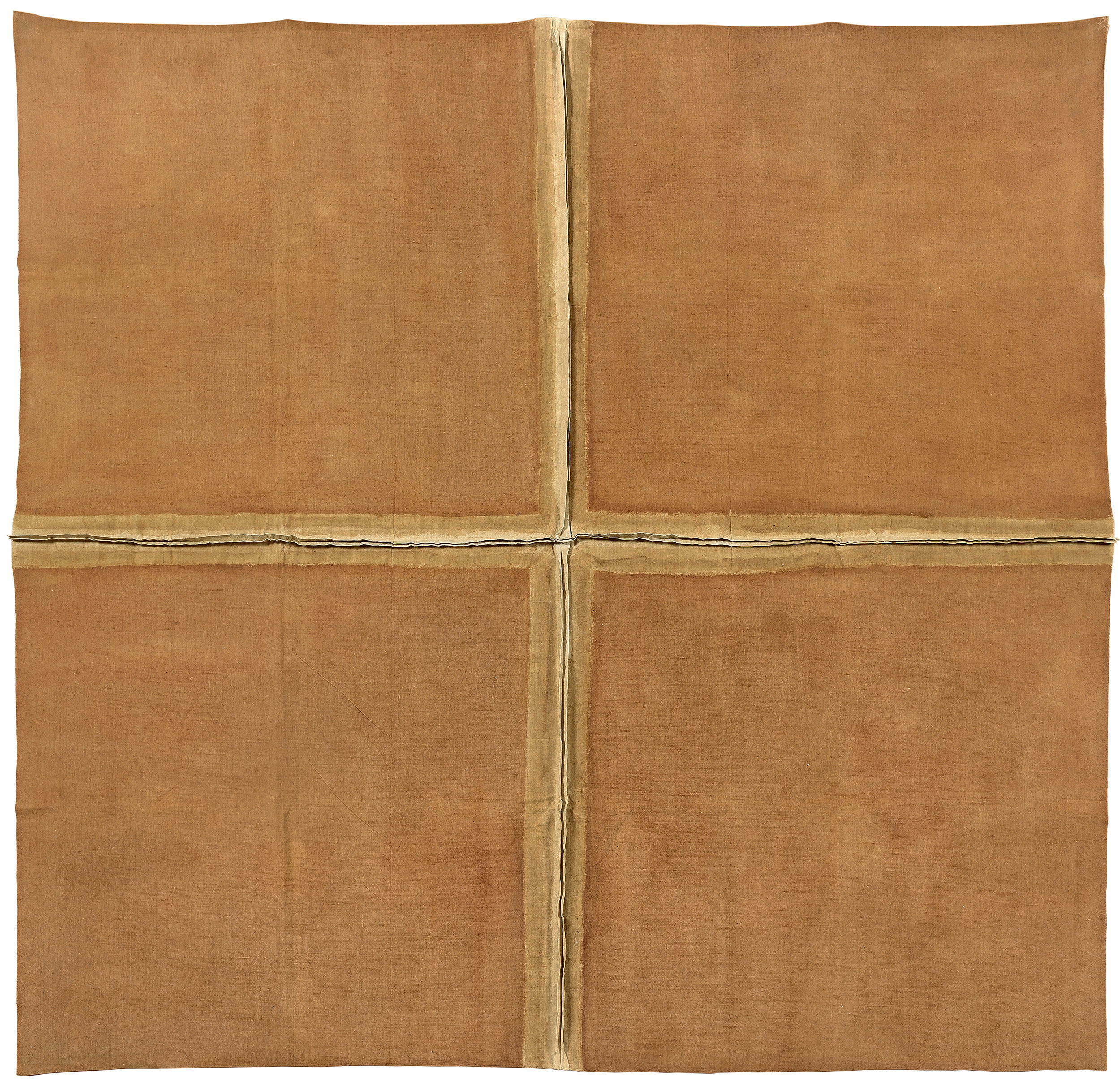 From 1973 to 1975, Noël Dolla developed his Crosses series, marking the return of colour to his artistic practice. The painting is also suggested by the frontal nature of the work, which is composed of four panels of identical size, sewn together and impregnated with dots of colour that invade the surface of the canvas until they are saturated. The seams of the assembled panels form a relief in the form of a cross or frame. The elements usually at the edge of a painting then form the pattern of the work.