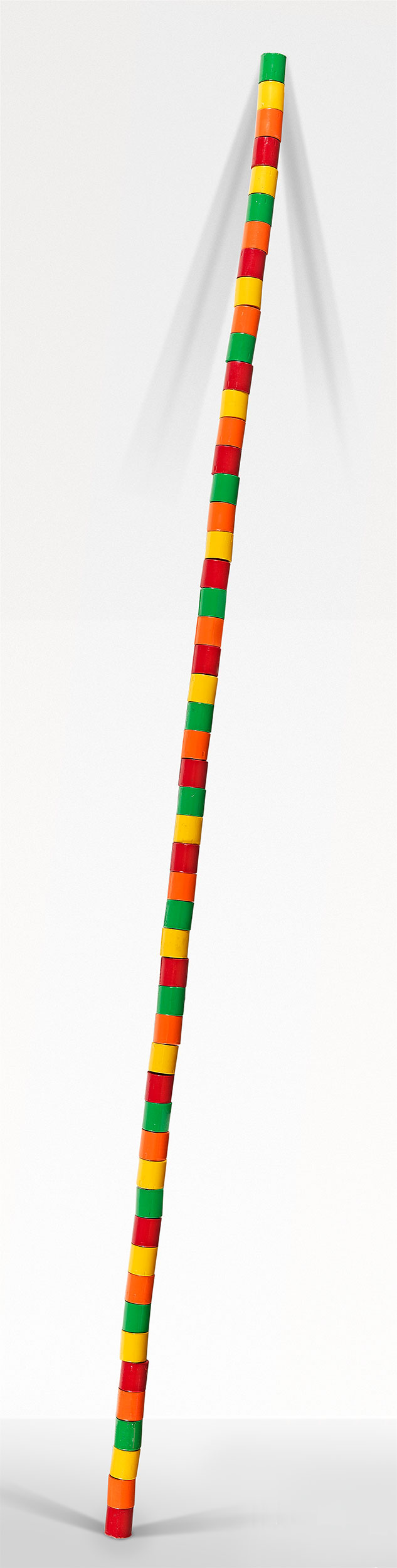 The wooden bars have contributed to the recognition of this enigmatic artist. Random in size, they are objects that cannot be put on the wall. The bar is covered with coloured segments, in primary and uniform shades (green, yellow, orange, red), forming chromatic sequences that permute together and systematically contain an error.
