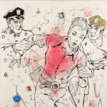 Les trames de la broderie apparaissent en arrière-plan, rappelant l’intérêt de l’artiste pour les tissus imprimés en tant que supports picturaux dans les années 1960. Des objets issus du quotidien, comme des épingles, des chaines, sont accrochés sur la toile et sur les personnages rappelant la culture punk.
