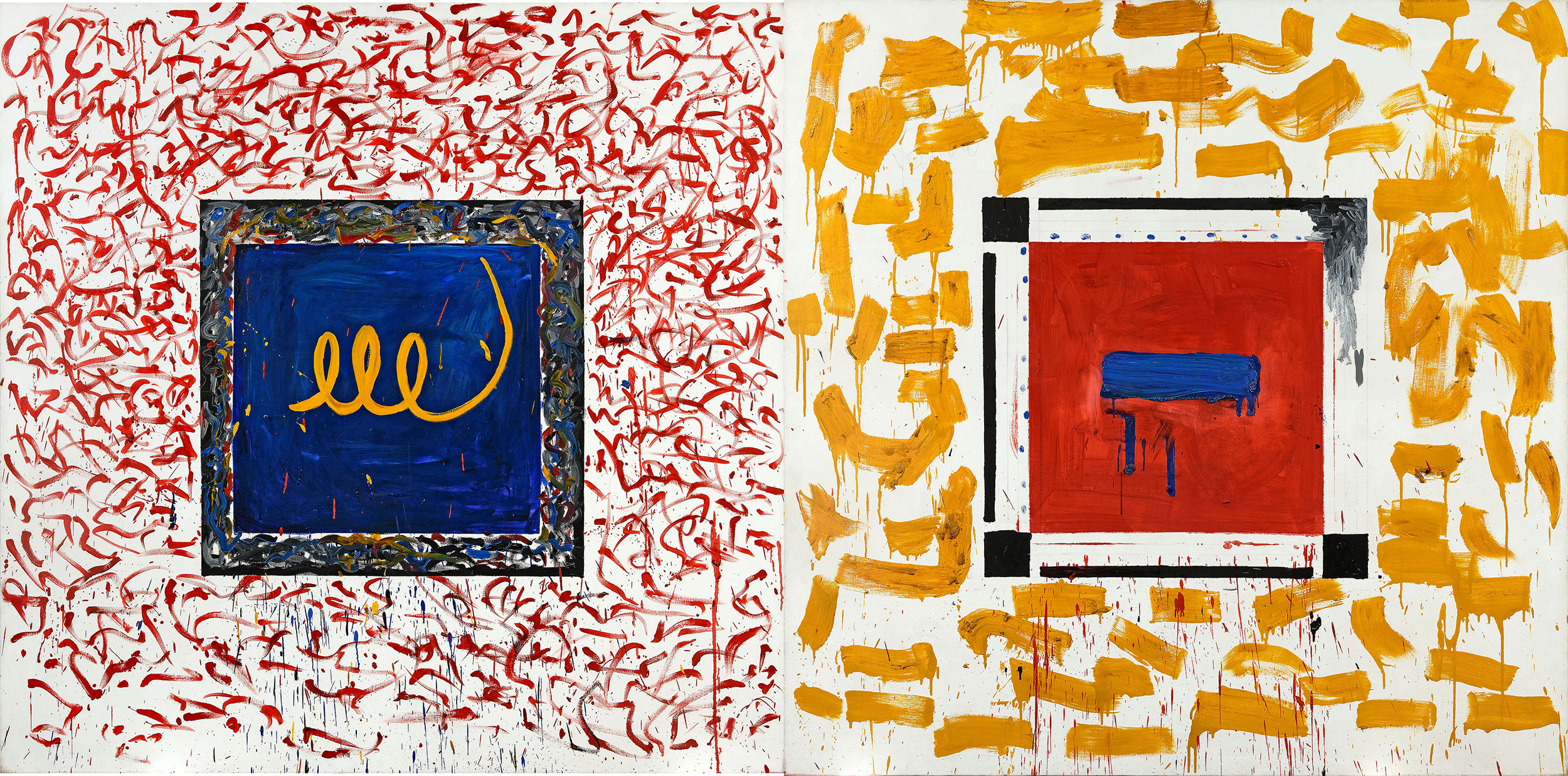 In Bop, op, pop, punk, the artist favours the diptych. The canvases are constructed identically with alternating squares and coloured brushstrokes, creating an opposition between order and chaos, smooth geometric shapes and drips. In the centre, two enigmatic motifs stand out strongly against a monochrome background. The two paintings respond to each other and resonate with each other, particularly through the play of colours. In her search for a pictorial language, Pat Steir seems to be turning to a more « artisanal », more « primitive » art with motifs borrowed from prehistory, oriental, Tibetan or Amerindian art. These « mysterious inscriptions with magical, talismanic connotations give the painting a singular mystical power » (Douglas James Johnson).