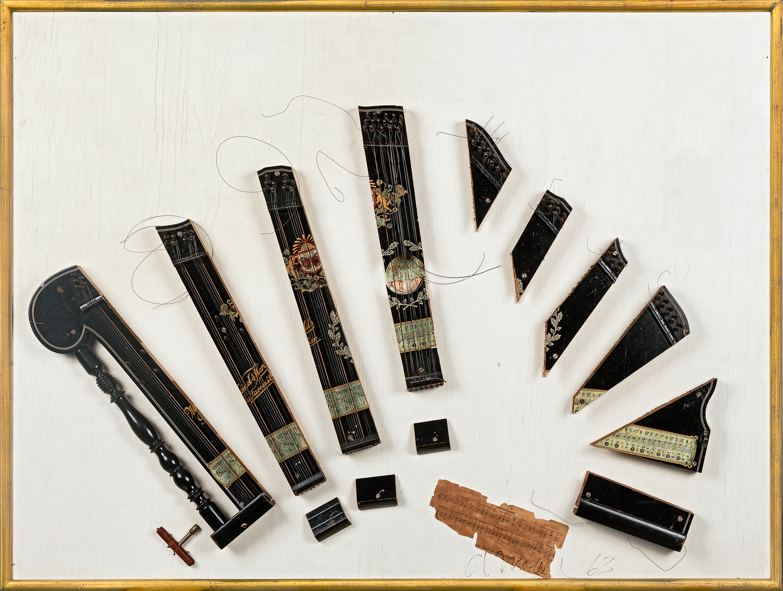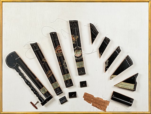 Les instruments de musique comptent parmi les objets les plus utilisés par l’artiste pour la conception de ses œuvres. Celui qui se définit lui-même comme un « montreur d’objets » nous propose ici la décomposition d’une cithare qui laisse apparaître les différents matériaux qui composent l’instrument. En 2002-2003, Arman renoue avec la peinture de chevalet dans Serious Paintings, associant la recomposition d’instruments de musique à leur « mise en scène » en peinture.