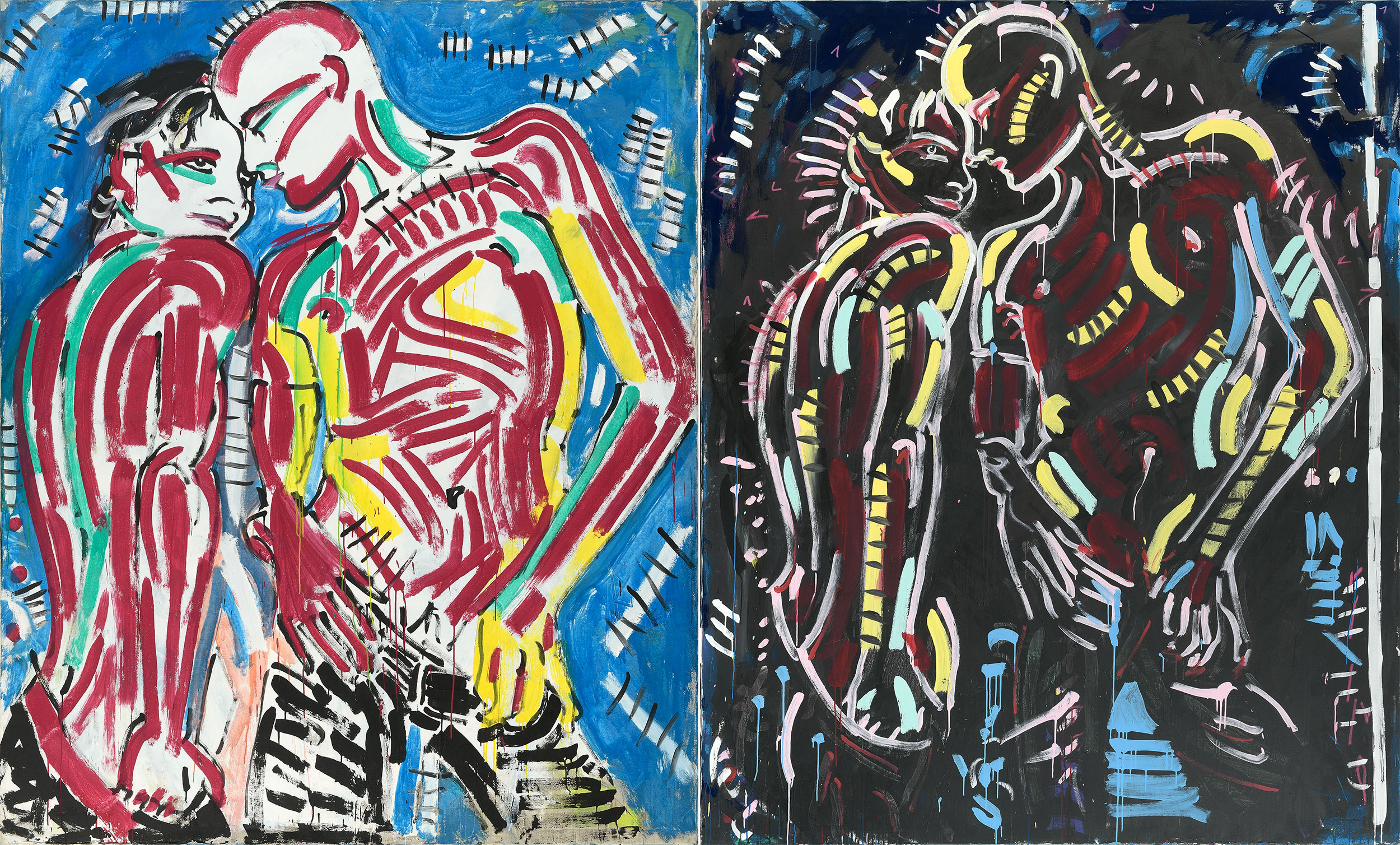 A Berlin, le mouvement des Nouveaux Fauves est formé entre autre par les artistes Middendorf, Zimmer, Fetting ou encore Salomé. Ce dernier est représenté dans ce diptyque avec Castelli dans un double portait aux couleurs très vives jouant sur la confusion des genres des deux protagonistes. La peinture de Castelli est expressive, théâtrale et teintée d’érotisme. Sa pratique artistique lui permet de jouer différents rôles et d’incarner une figure androgyne travestie, questionnant les genres au sein d’une société puritaine. La culture glam rock, apparue au milieu des années 1970 en Angleterre, a largement contribué en ce sens à travers ses figures iconiques, redéfinissant les notions de masculinité et féminité.