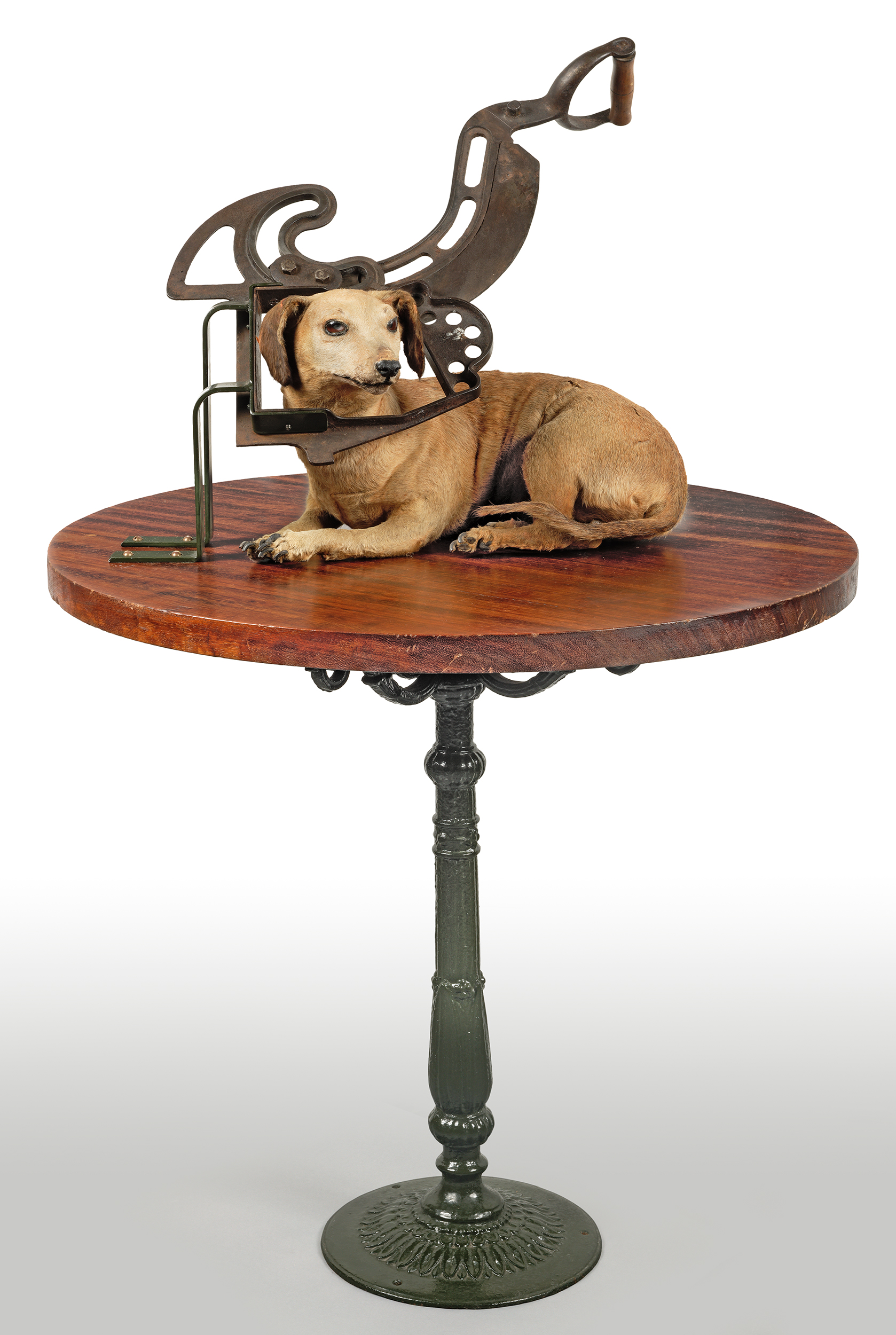 Cette œuvre ne peut actuellement être exposée pour des raisons de conservation Cette œuvre fait partie des Natures Mortes de l’artiste. Ses mises en scènes constituées de cadavres d’animaux naturalisés et d’objets, manifestent un refus permanent des conventions aussi bien qu’une relation ambiguë avec la mort et les procédés de conservation. Daniel Spoerri s’intéresse aux rebus et aux déchets dans une société qui se tourne vers les objets neufs et jetables. Il chine des objets avant de leur donner une seconde vie dans ses assemblages. Ils ont déjà été utilisés et présentent donc les traces et les vestiges de leurs vies précédentes. Ils sont pour la plupart marqués par le temps, abîmés et rafistolés. Le point commun entre tous les éléments qu’il combine est leur portée historique, narrative et sentimentale.