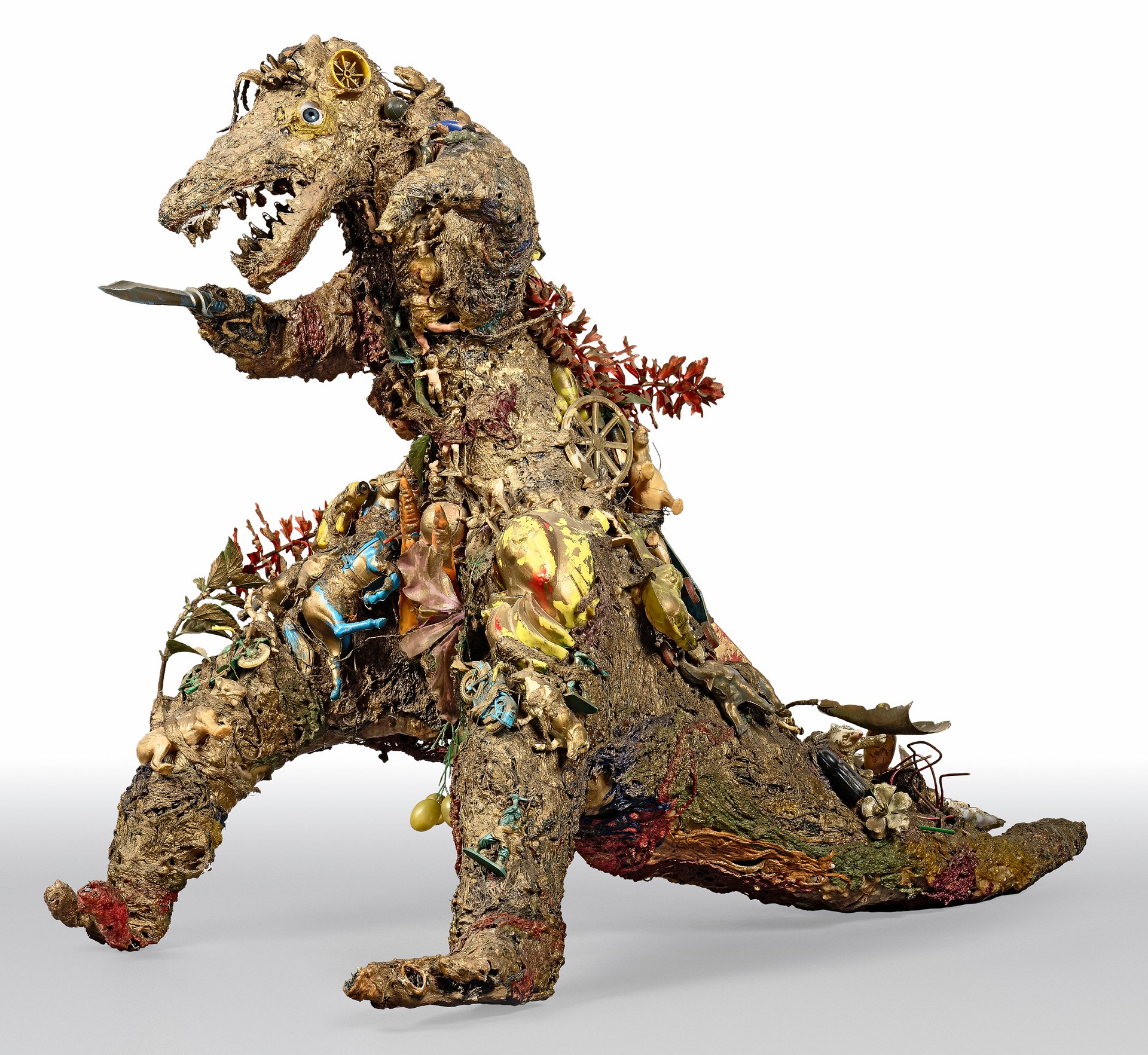 The Monster is made by compiling and assembling found objects, around an iron structure. Here plastic toys dominate and compose the work. Some of them, melted, are no longer recognizable. This link to childhood contrasts with the figure of this threatening hybrid armed with a fake knife. The tension of the work lies in the opposition between the objects and materials used, which evoke innocence and carefreeness, and the frightening composite figure, which refers to the incest that the artist suffered during her adolescence and about which she did not speak until she was 64 years old in her book Mon Secret. The theme of the monster and the interest in everything that is « disturbingly strange » populate the artist’s work. A few years later, she produced Le Monstre de Soisy in collaboration with Martial Raysse and her husband Jean Tinguely.