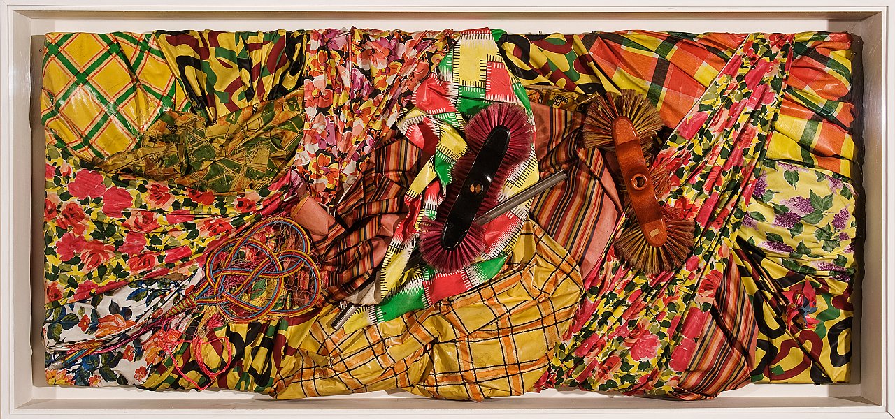 Plastique à la tapette is emblematic of his Panoplies work (integrating new objects into his works). Broom heads and a carpet beater emerge from a background covered with tablecloths and waxed canvas. The artist plays with materials, movement and shapes as a painter would. The different elements evoke the private space of the home. It is the daily life of the woman of the 1960s that is presented to us, a period of profusion of utensils dedicated to the household and the care of the home. This work could be contrasted with her work on the military theme, with its sharper and more masculine forms. However, it reveals the great plurality of his work, which is intended as a commentary on the times he is living in. The Panoplies are still lifes of the modern, abundant consumer society. The industrial colours are created to attract and please the consumer.