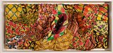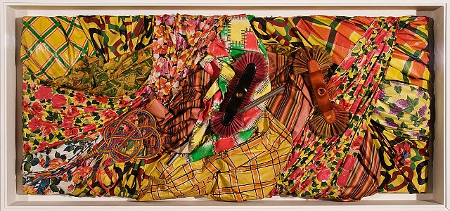 Les trames de la broderie apparaissent en arrière-plan, rappelant l’intérêt de l’artiste pour les tissus imprimés en tant que supports picturaux dans les années 1960. Des objets issus du quotidien, comme des épingles, des chaines, sont accrochés sur la toile et sur les personnages rappelant la culture punk.