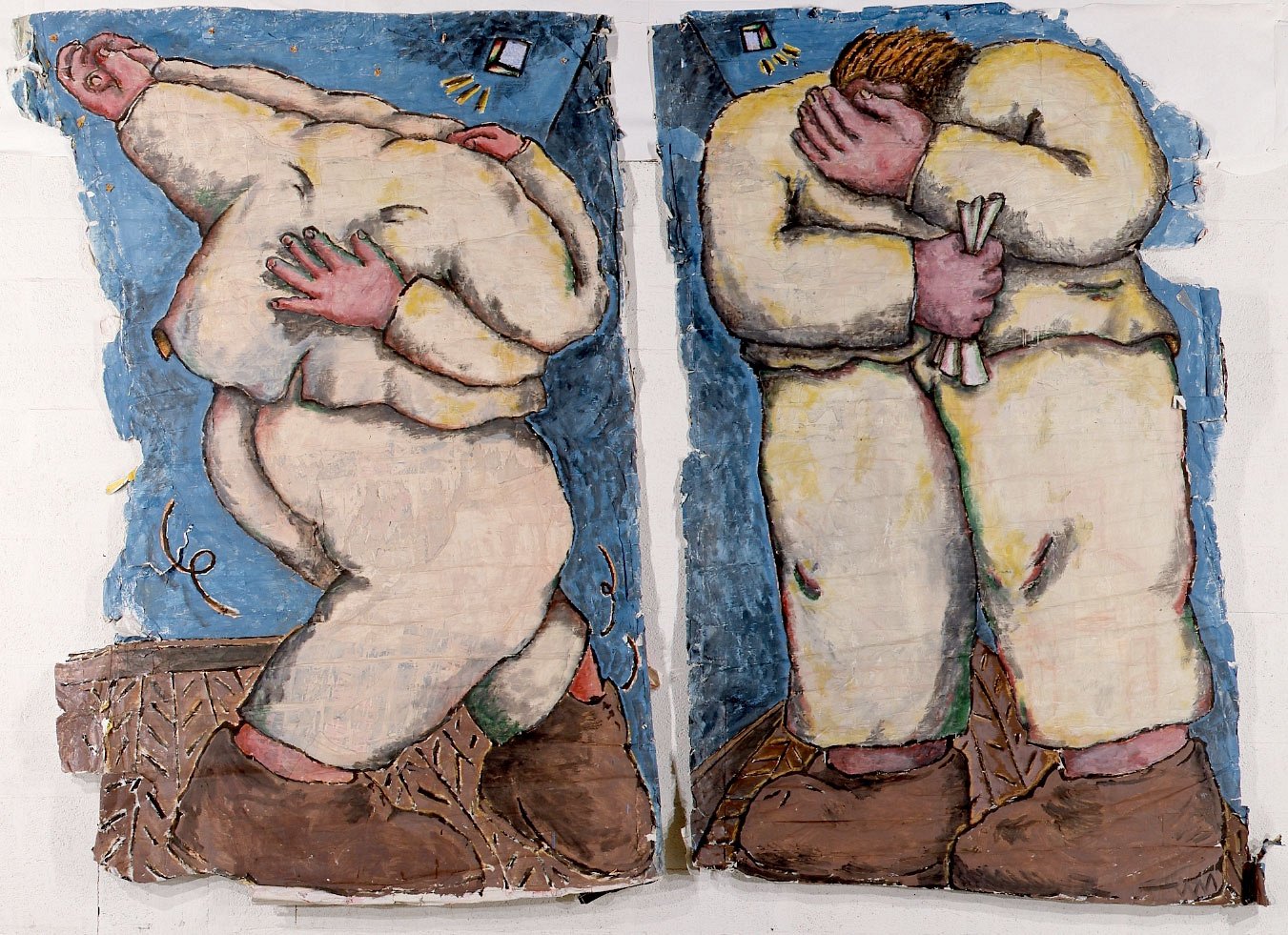 During the 1980s, he developed a coloured painting on piles of posters where anonymous bodies with disproportionate limbs are omnipresent.