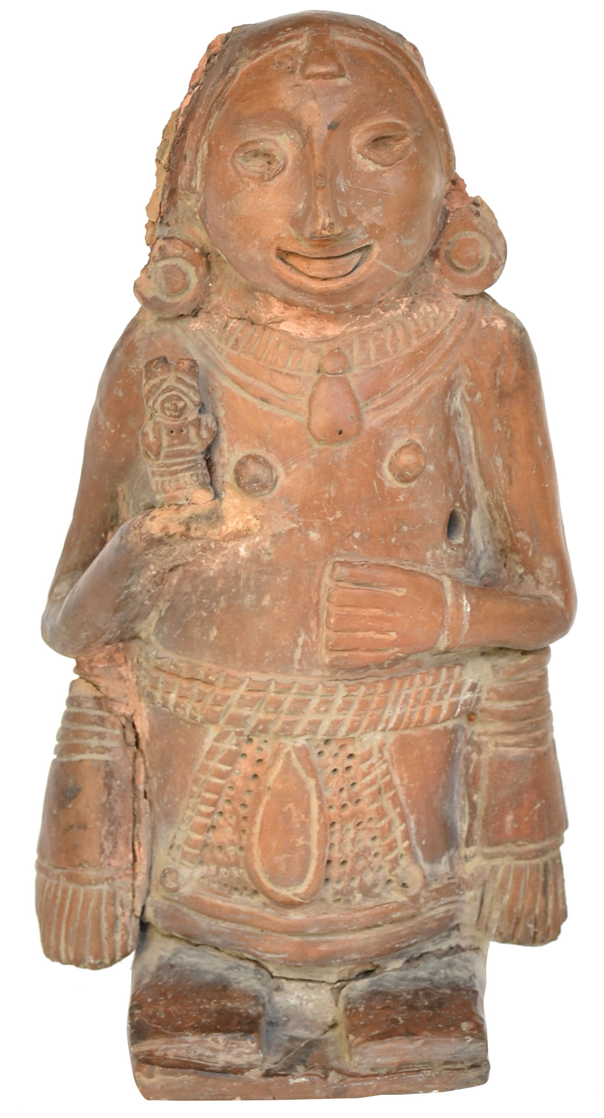The bas-relief on metal plate has a double decoration on the front and back. On the front, it represents two figures ; the larger one wears a headdress decorated with animal figures, a neckband with an animal head, he has a large nose, large almond-shaped eyes, hemmed lips and joined hands. The second figure is smaller, hands joined, and wearing a tiara with circular motifs.