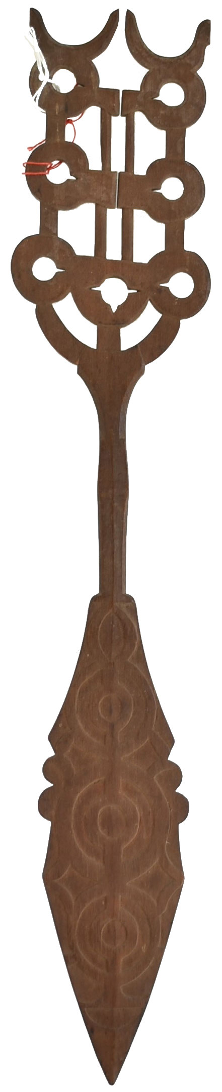 Il bassorilievo su una piastra di metallo ha una doppia decorazione sul fronte e sul retro. Sul fronte, raffigura due figure ; la più grande indossa un copricapo decorato con figure di animali, un collare con una testa di animale, un grande naso, grandi occhi a mandorla, labbra orlate e mani unite. La seconda figura è più piccola, con le mani unite, e indossa un diadema con motivi circolari.