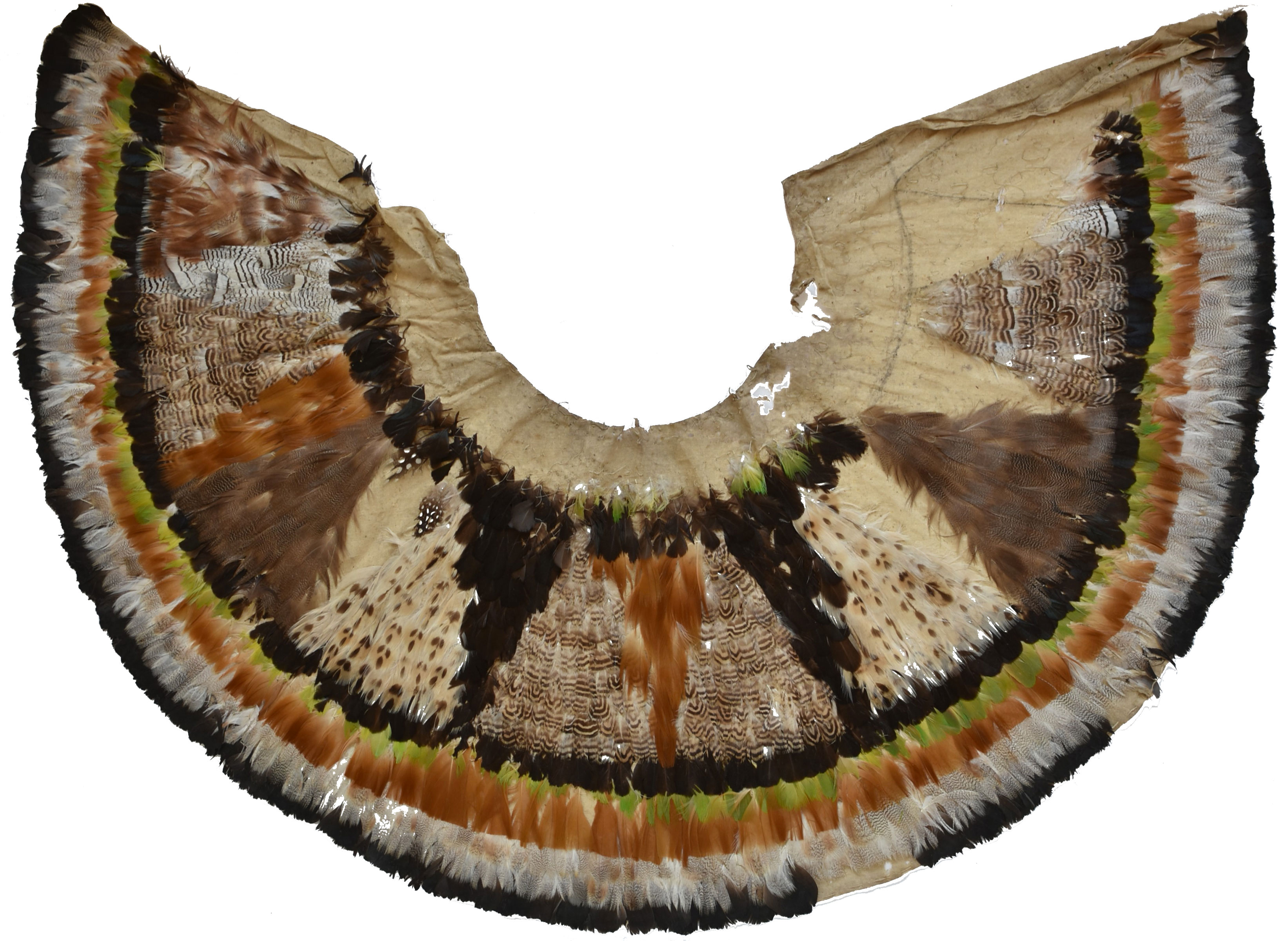 Le bas-relief sur plaque métallique porte un double décor sur le recto et le verso. Sur la face, il représente deux personnages ; le plus grand porte une coiffe ornée de figures animales, un tour de cou avec une tête d’animal, il a un nez large, de grands yeux en amande, des lèvres ourlées et les mains jointes. Le second personnage est plus petit, les mains jointes, et coiffé d’un diadème à motifs circulaires.