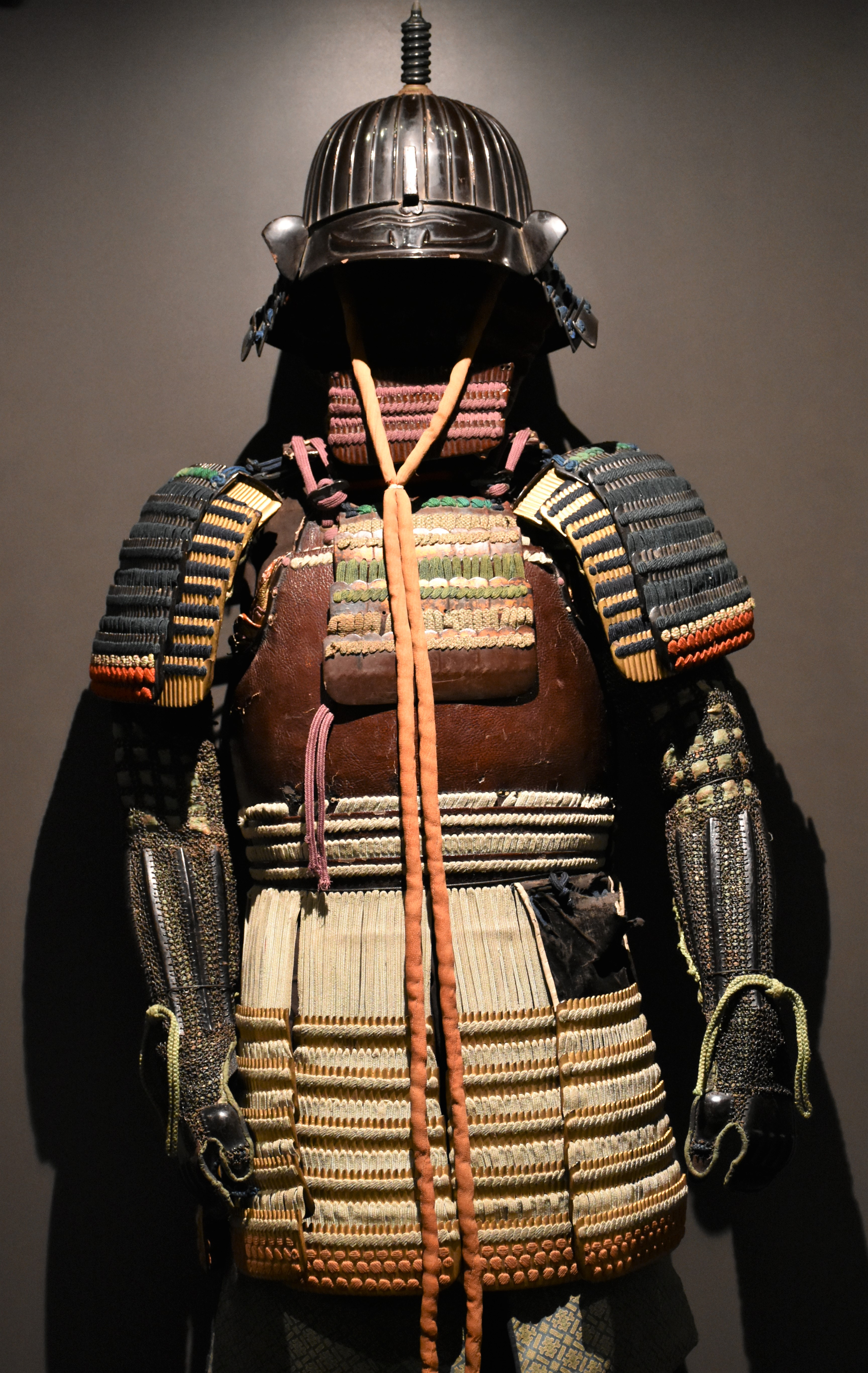 Armure d’apparat composée de plusieurs éléments : casque (kabuto), cuirasse (dou), protection du visage et de la gorge (yodarekake), protection de cou (shikoro), chemise (shitagi), protections des jambes(suneate) et genoux, jupe (kuzazuri) et cuissard (haedate). L’armure de samouraï est constituée de lamelles de métal et de cuir et pèse entre 20 et 30 kg. Au fil des siècles, elle évolue et devient plus légère grâce à l’utilisation de l’acier (haramaki ou do-maru).