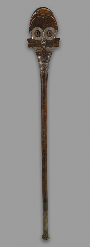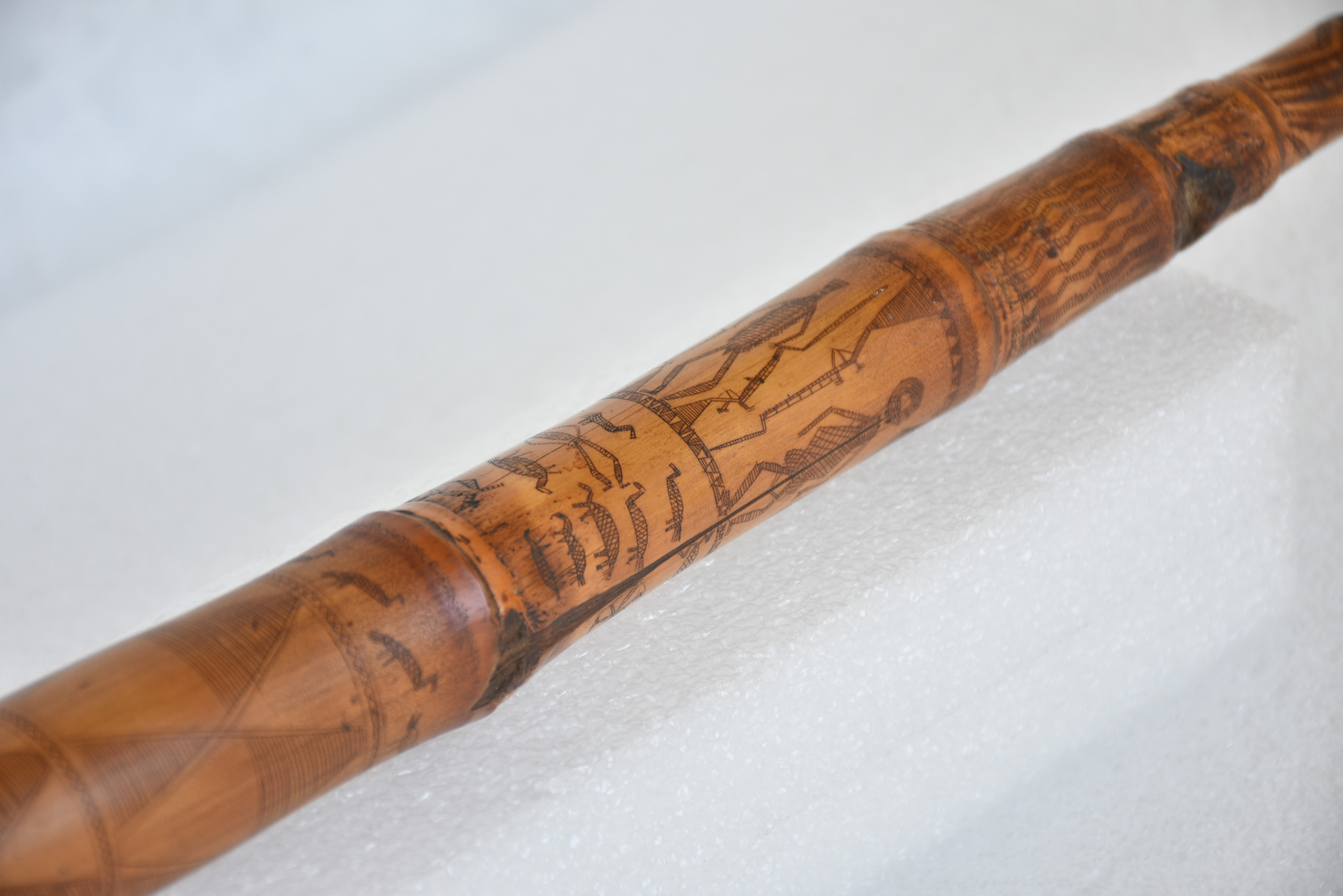 Tige de bambou portant un décor gravé de motifs géométriques, de personnages et d’animaux stylisés. La tige est incisée quand le bambou est encore vert à l’aide de quartz, de pinces de crustacés ou d’outils métalliques. Elle est ensuite recouverte d’huile ou passée au-dessus du feu pour l’enduire de suie. Les motifs incisés ressortent en noir.